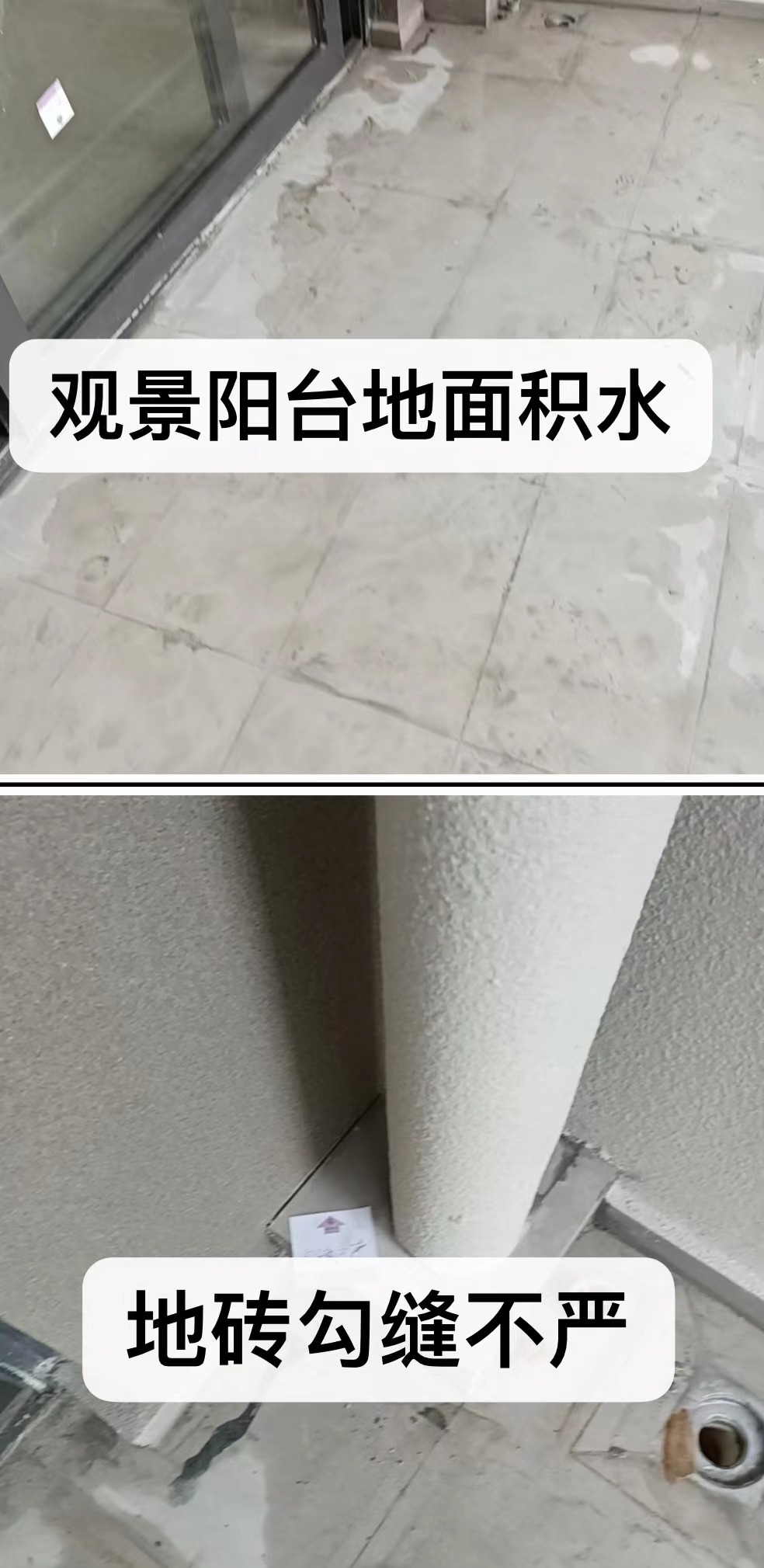房屋主要存在问题有: 观景阳台地面积水,地砖勾缝不严,客厅推拉门下方没有溢水口,客厅推拉门门框污染,玄关天花开裂,厨房橱柜门大小头,玄关厨房鞋柜橱柜缺装饰贴,卧室木地板松动,公卫主卫马桶未打胶固定,全屋墙面多处刮花等,累计约38处质量问题。